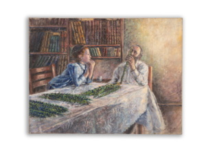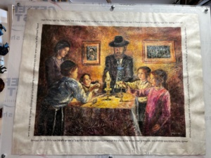 Born in Jerusalem into an orthodox family of English origin, Tamar Finkelstein showed at an early age a strong inclination For painting and design. Young Tamar’s motivation convinced her parents, to look for guidance and instruction outside of the regular school framework. To this end, she enrolled in the courses of Yossi Rosenstein, a well-known academic painter of traditional Jewish scenes. In his classes, she acquired basic knowledge and techniques essential to an aspiring professional artist. After marriage, and in spite of the demands of mothering a family blessed with many children, Tamar pursued her self-directed artistic education. The encounter with respected painter and teacher Shaul Shatz was instrumental for her technical and psychological development. As a result of this association, Tamar expanded her inspired interpretations of Jewish traditional imagery into the more challenging field of contemporary Jewish art. Her work became denser in psychological content, and her style grew in power and individuality.