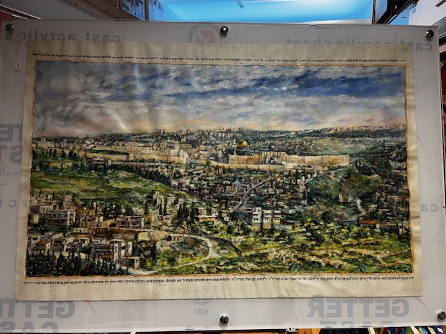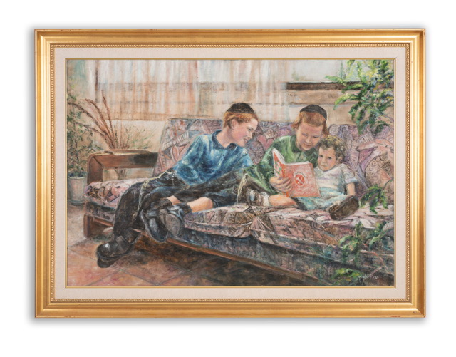 Born in Jerusalem into an orthodox family of English origin, Tamar Finkelstein showed at an early age a strong inclination For painting and design. Young Tamar’s motivation convinced her parents, to look for guidance and instruction outside of the regular school framework. To this end, she enrolled in the courses of Yossi Rosenstein, a well-known academic painter of traditional Jewish scenes. In his classes, she acquired basic knowledge and techniques essential to an aspiring professional artist. After marriage, and in spite of the demands of mothering a family blessed with many children, Tamar pursued her self-directed artistic education. The encounter with respected painter and teacher Shaul Shatz was instrumental for her technical and psychological development. As a result of this association, Tamar expanded her inspired interpretations of Jewish traditional imagery into the more challenging field of contemporary Jewish art. Her work became denser in psychological content, and her style grew in power and individuality.